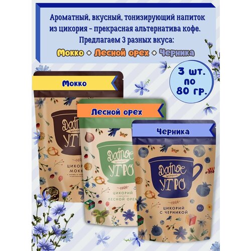Доброе утро Цикорий натуральный — вкус Мокко, Лесной орех, Черника, 3 упаковки по 80гр
