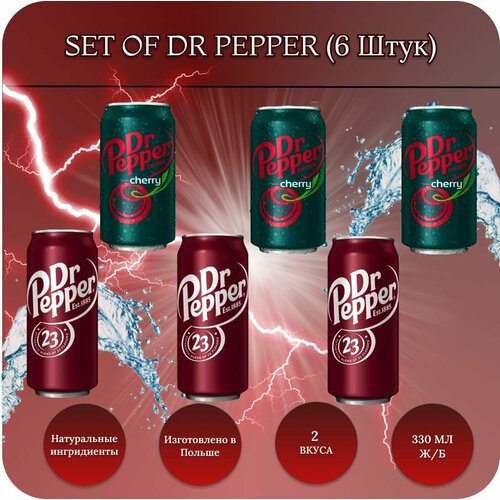 Набор напитков Доктор Пеппер Классик и Вишня/ Dr Pepper Classic & Cherry, Mix 2X3/ 6 банок по 330 мл.