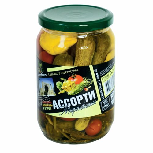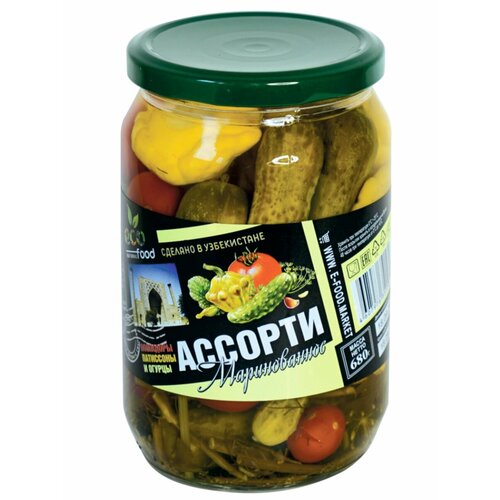 Ассорти (помидоры, патиссоны и огурцы) маринованное 680г (Ecofood)