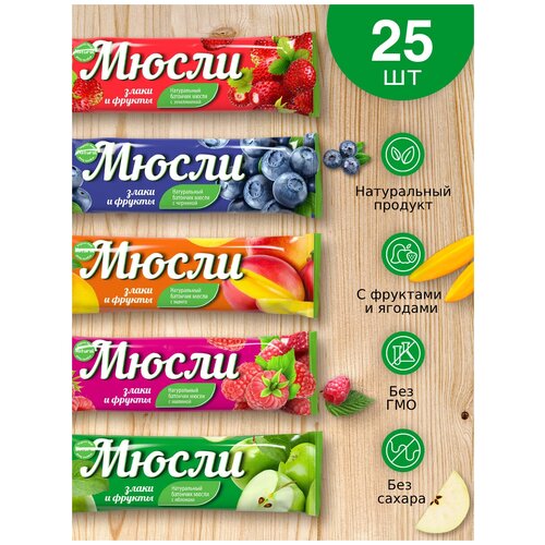 Батончики мюсли злаковые Effort без сахара ассорти: земляника, малина, манго, черника, яблоко и злаки, 25 шт по 40 гр