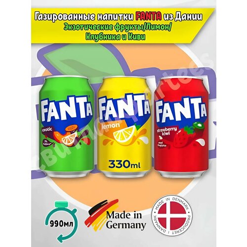 Газированный напиток Fanta Лимон, Клубника-киви, Экзотические фрукты, 3 шт. по 330 мл Дания фанта