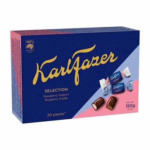 Шоколадные конфеты Karl Fazer Selection Raspberry yoghurt & Blueberry truffle ассорти (Клубничный йогурт и черничный трюффель), 150 г