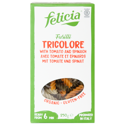 Макароны Felicia Fusilli tricolore BIO Спиральки из рисовой муки с добавлением шпината и томатов без глютена БИО, 250 г