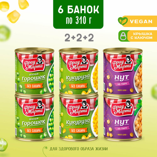 Горошек зеленый без сахара, кукуруза без сахара, нут на пару, Фрау Марта 310 г, 6 шт