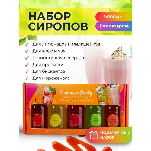 Подарочный набор фруктовых и ягодных сиропов FUN’N’JOY Summer Party: Лимон, Малина, Груша Яблоко, Клубника Земляника, Вишня: 5 шт. по 100 мл.