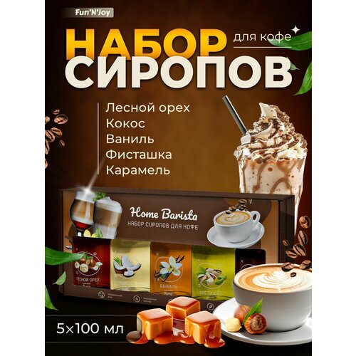 Подарочный набор сиропов FUN’N’JOY Home barrista для кофе ваниль, фисташка, лесной орех, кокос, карамель: 5 шт. по 100 мл.
