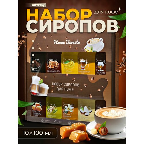 Подарочный набор сиропов FUN’N’JOY Home barrista для кофе: ваниль фисташка лесной орех кокос карамель шоколад солёная карамель амаретто ирландский крем банан: 10 шт. по 100 мл.