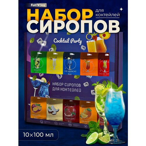 Подарочный набор фруктовых сиропов для коктейлей FUN’N’JOY Cocktail Party мохито текила санрайз блю кюрасао пина колада кокос гренадин апельсин маракуйя клубника: 10 шт. по 100 мл.