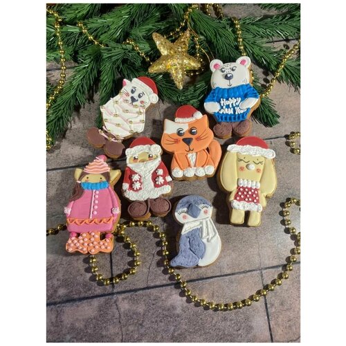Набор новогодних имбирных пряников ручной работы "Дедушка Мороз и компания" 7шт. от кондитерской Fёdor Kotoff