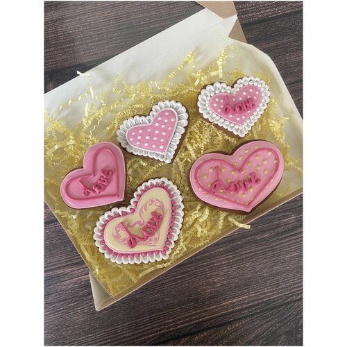 Подарочный набор имбирных пряников ручной работы 5 шт. на 14 февраля, 8 марта "Сердца" от кондитерской Fёdor Kotoff