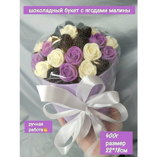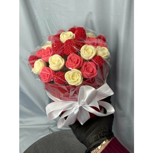 Букет из 21 белых шоколадных роз и 13 ягод малины мармеладные в шляпной коробке подарок на день рождения, юбилей, учителю, маме , новый год, мужу, на свадьбу