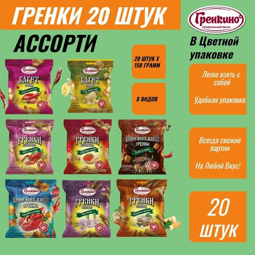 Гренки ассорти 20 штук по 150 грамм 8 видов Сухарики снеки ТМ "гренкино"