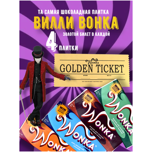 Шоколад Wonka. Шоколад Вилли Вонка с золотым билетом 4 плитки по 90 грамм набор