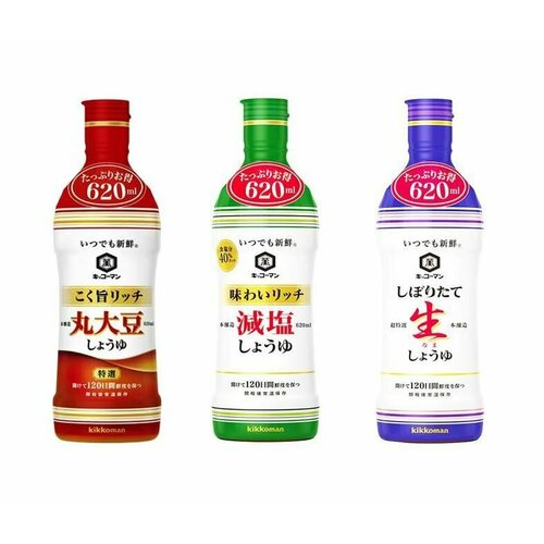 Японский соевый соус Kikkoman с насыщенным вкусом и низким содержанием соли, тёмный и насыщенный из цельных соевых бобов (3 штуки в наборе), 1860 мл, Япония