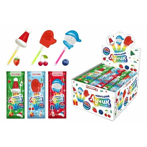 Лучик Новогодний карамель на светящейся палочке (шапочка, снеговик, варежка), блок 30 шт. (10г х 30 х 24)