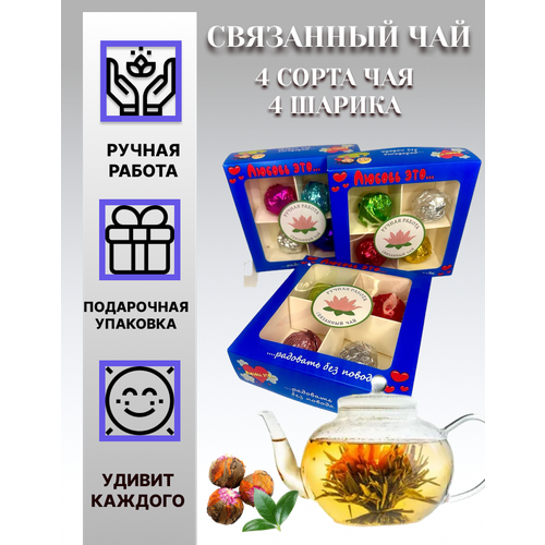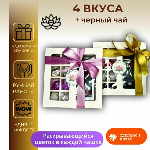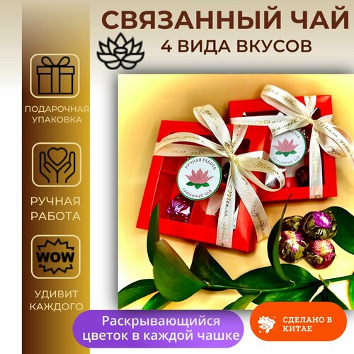 Чай подарочный связанный зеленый, распускающийся цветок, 4 шт. разных вкусов .
