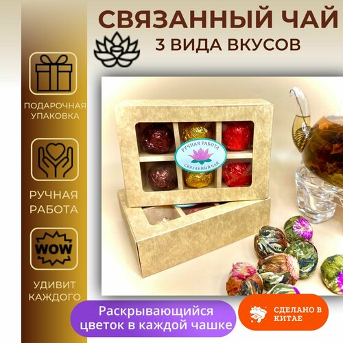 Чай подарочный связанный зеленый, распускающийся цветок, 6 шт. 3 вкуса , крафт