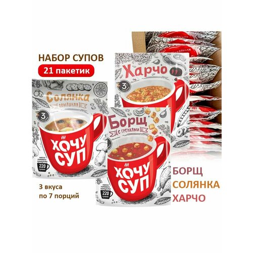 Суп быстрого приготовления 21шт Борщ, Харчо и Солянка "ХочуСуп" ассорти в пакетиках без варки