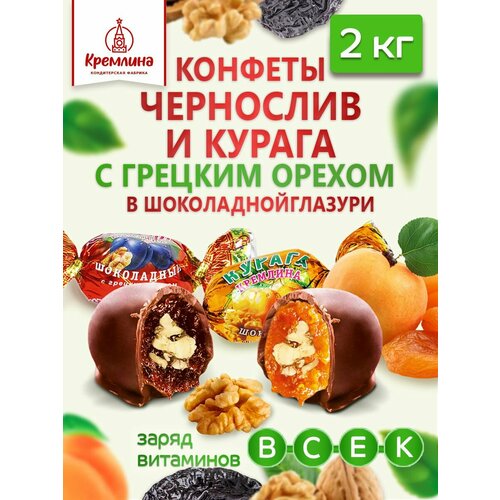Шоколадные конфеты из сухофруктов Чернослив с грецким орехом и Курага с грецким орехом, короб — телевизор 2 кг
