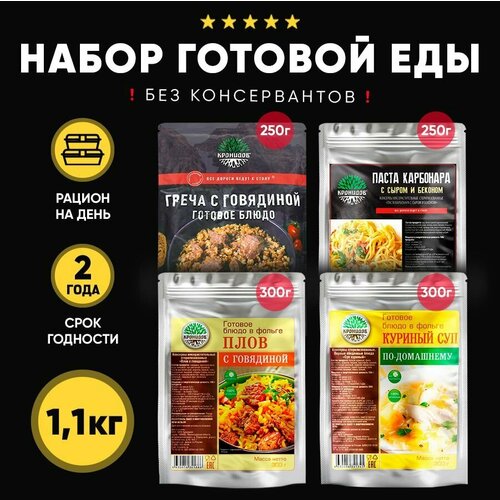 Набор из 4 готовых блюд в фольге от ТМ "Кронидов" Греча с говядиной, Паста Карбонара, Плов с говядиной, Суп куриный. Консервированные блюда