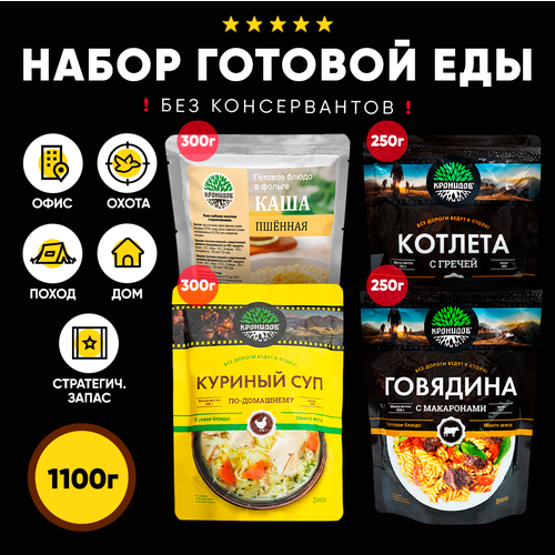Набор из 4 готовых блюд в реторт-пакете "Кронидов" Каша пшенная молочная/Каша гречневая с котлетой/Суп куриный по-домашнему/Макароны с говядиной