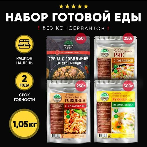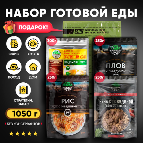 Набор из 4 готовых блюд в фольге от ТМ "Кронидов" Греча, Рис, Плов с говядиной, Суп куриный по-домашнему + Подарок БНП 1 шт.