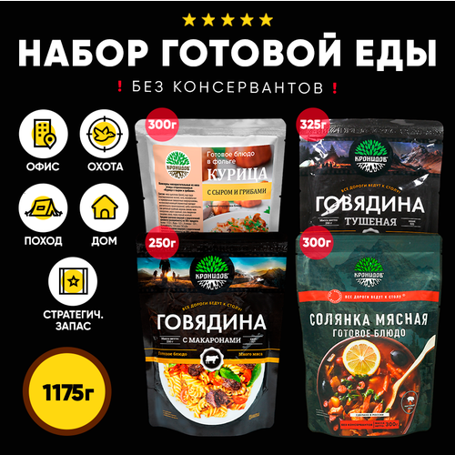 Набор из 4 готовых блюд в реторт-пакете "Кронидов" Курица с грибами и сыром/Солянка/Макароны с говядиной/Говядина тушеная высший сорт
