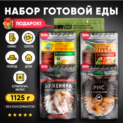 Набор из 4 готовых блюд в фольге от ТМ "Кронидов" Буженина в собственном соку, Рис с говядиной, Греча с говядиной, Суп куриный + Подарок БНП 1 шт. Консервированные блюда