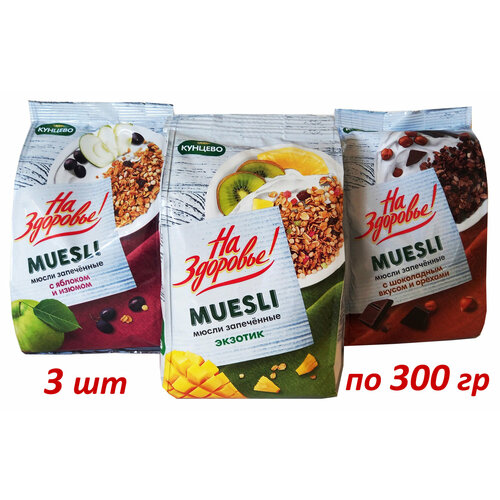 Набор Мюсли Кунцево с яблоком и изюмом, экзотик, шоколад, 3х300г