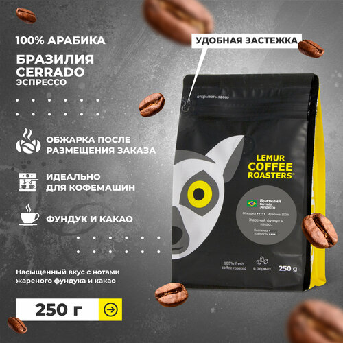 Свежеобжаренный кофе в зернах Бразилия Cerrado Эспрессо Lemur Coffee Roasters, 250 г