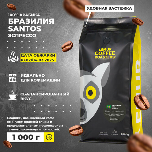 Свежеобжаренный кофе в зернах 1 кг Бразилия Сантос Эспрессо / Santos Lemur Coffee Roasters, дата обжарки 18.02.2025/04.03.2025