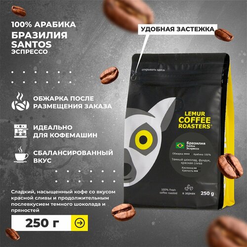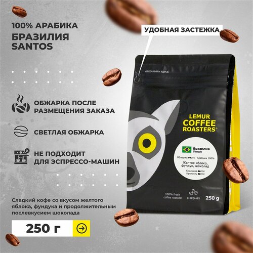Свежеобжаренный кофе в зернах Бразилия Сантос / Santos Lemur Coffee Roasters, 250 г