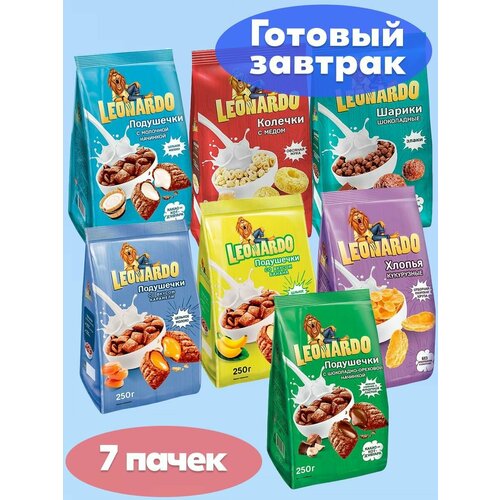 Leonardo, готовый завтрак ассорти 7 пачек (шарики, колечки, подушечки, хлопья)