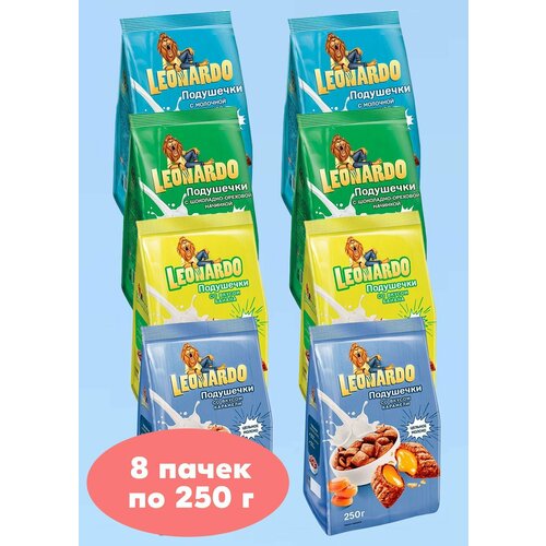 KDV, Leonardo, готовый завтрак, Подушечки с молочной, шоколадно-ореховой, банановой и карамельной начинкой 8 пачек по 250 грамм