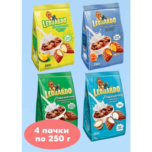 KDV, Leonardo, готовый завтрак, Подушечки с молочной, шоколадно-ореховой, банановой и карамельной начинкой, 4 пачки по 250 грамм