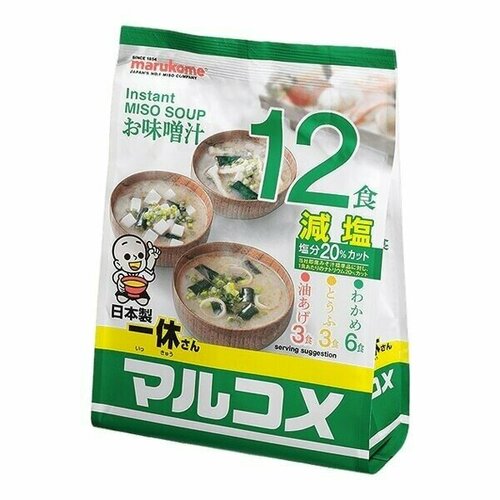 Мисо суп ассорти быстрого приготовления с пониженным содержанием соли, обжаренным тофу и зелёным луком (3 штуки в наборе), 36 порций, Marukome, Япония