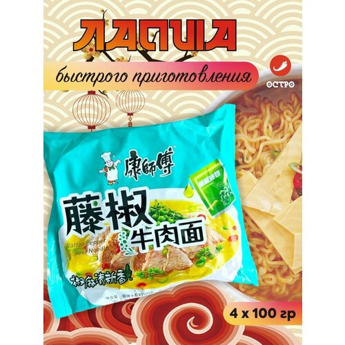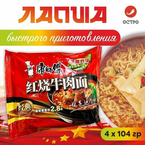 Китайская лапша быстрого приготовления с тушеной говядиной упаковка 4 штуки / красная