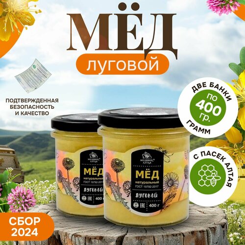 Алтайский натуральный мед "Луговой" 2 шт по 400г сбор 2024, стеклянная банка