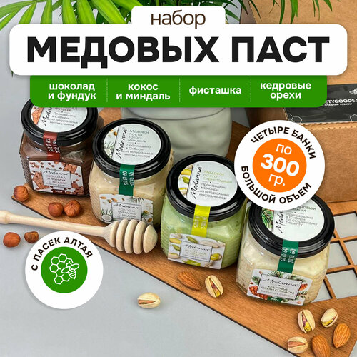 Подарочный набор "Медовые пасты 2": мёд с кедровыми орехами, с фисташкой, с шоколадом и фундуком, кокосом и миндалем. 4 банки по 300 г