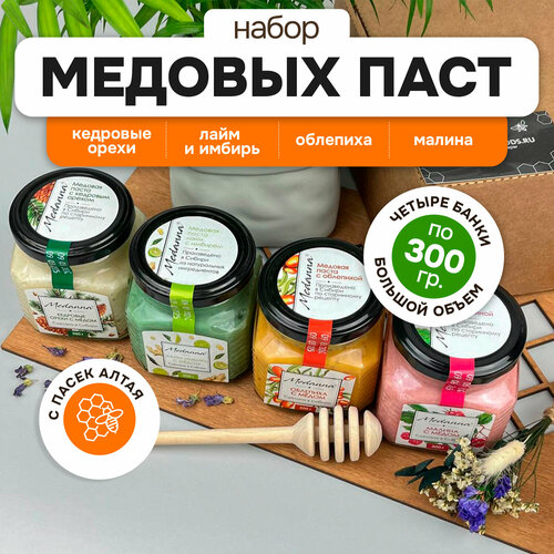 Подарочный набор "Медовые пасты": мёд с кедровыми орехами, с малиной, с лаймом и имбирем, с облепихой. 4 банки по 300 г