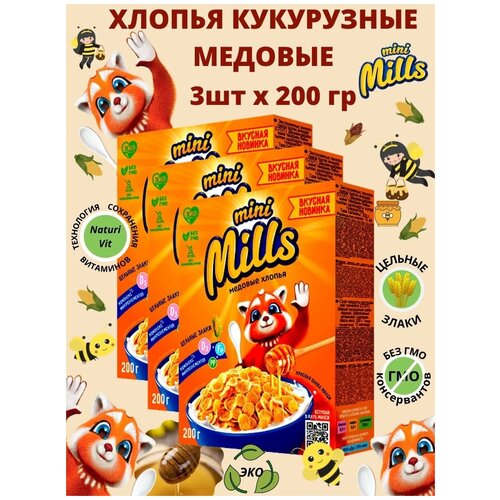 Набор Хлопья кукурузные Mini Mills медовые, обогащенные витаминами и железом 200г х 3шт