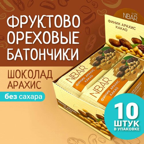 Батончики без сахара с арахисом и шоколадом: набор из 10 полезных диетических снеков из сухофруктов, семян и орехов, NBar Lite