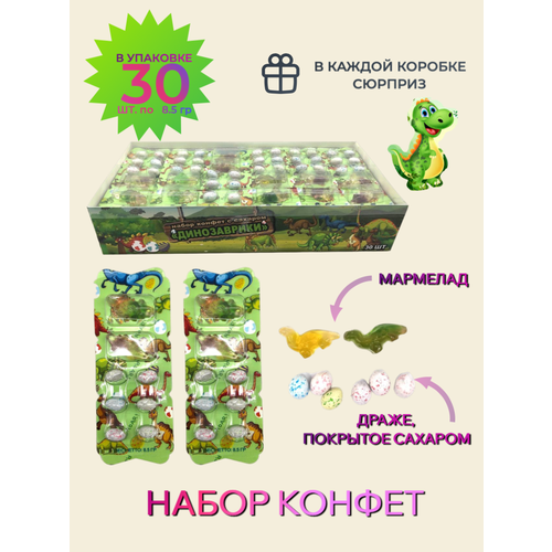 Набор конфет с сахаром "динозаврики"/Дражированные конфеты/ Сладости для детей ассорти, блок 30 шт./ 1 шт. 8,5 грамм