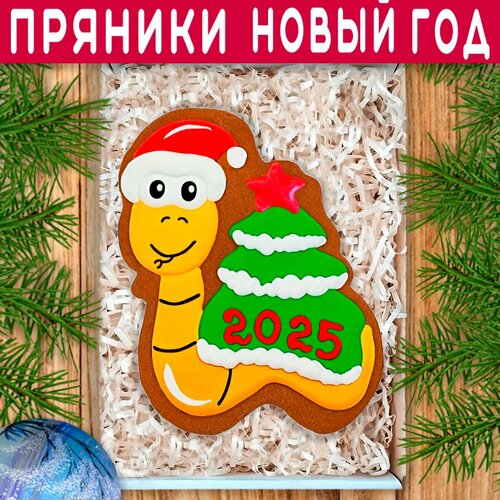 Новогодний пряник ручной работы "Cимвол года 2025 Змея с елкой" корпоративный подарок на Новый год коллегам 18х12 см