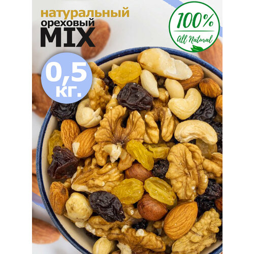 Ореховый микс (грецкий орех, кешью, фундук, миндаль, изюм, арахис), 0,5кг.