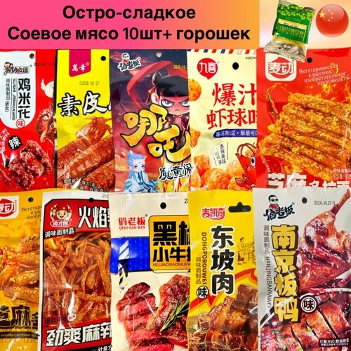 Остро сладенькое соевое мясо и снеки 10шт и горошек.