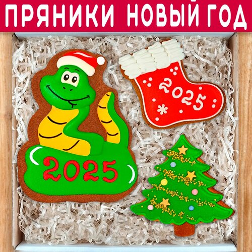 Подарочный набор новогодних пряников ручной работы Змея символ года корпоративный подарок на Новый год коллегам 18х18 см