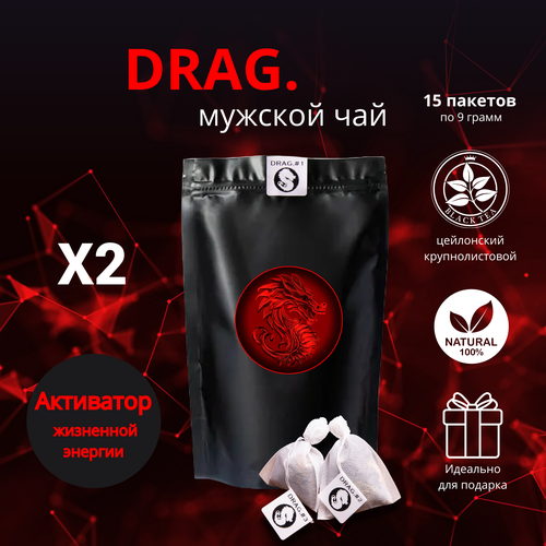 Чайный набор из двух упаковок премиального мужского чая DRAG. #1 — Активатор жизненной энергии. Чай черный листовой в пакетиках с бадьяном, маральим корнем, кардамоном, тимьяном, имбирем