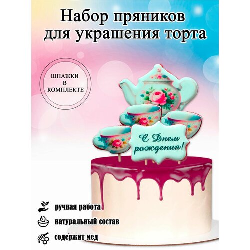 Имбирные пряники топперы, украшение на торт Чайный сервиз для украшения торта для мамы, бабушки, женщины, 5 шт