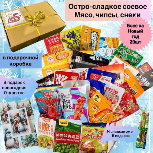 Азиатский бокс 20шт. Закуски из Азии, чипсы и острые снеки, креветки, остро-сладкое соевое мясо.